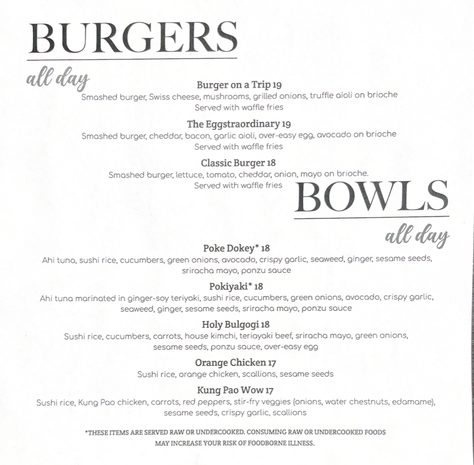 For lunch or dinner, savor their innovative bowls like the Poke Dokey, which combines fresh Ahi tuna, rice, and creamy sriracha mayo for $18. If you're craving something with a kick, the Holy Bulgogi bowl loaded with teriyaki beef and a fried egg is a must-try. Don't forget to pair your meal with one of their refreshing mocktails, such as the Mango Mule or Pineapple Mint Mojito, perfect for complementing your dining experience!